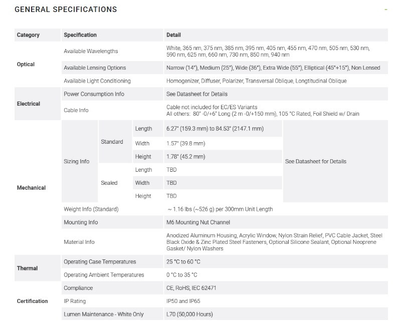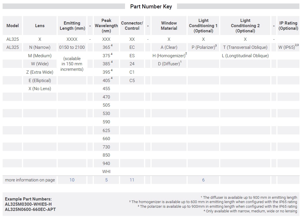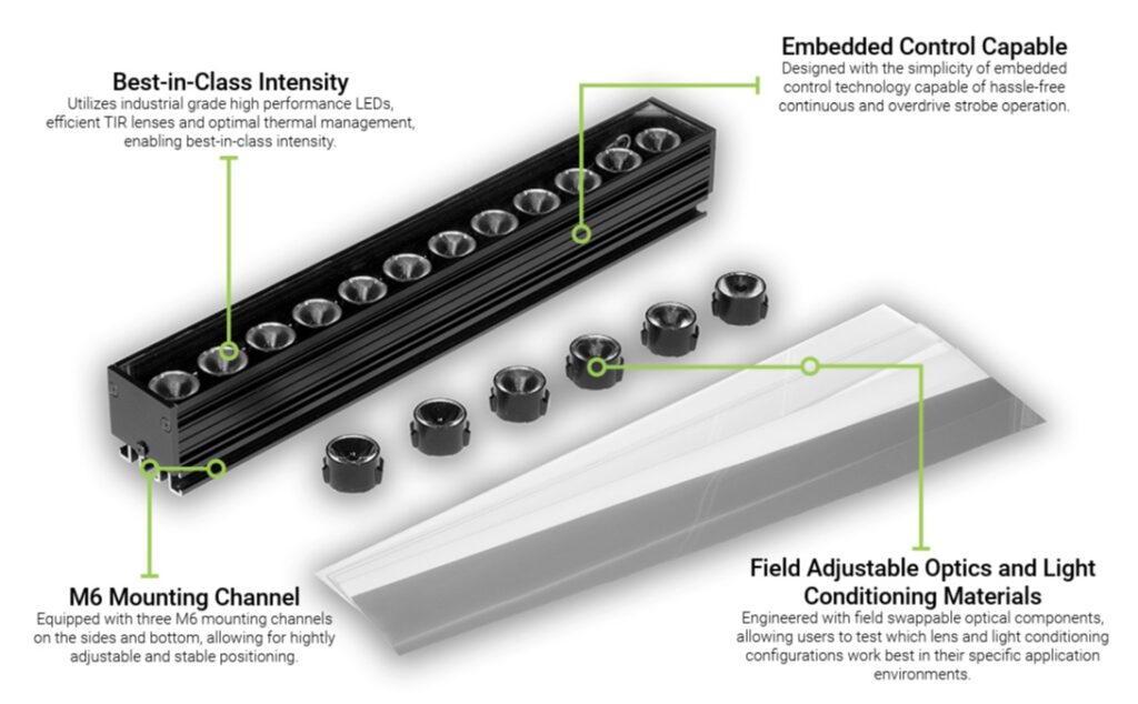 Solve your unique wide-area machine vision lighting challenges with the AL325 Modular Bar Light Series. This innovative modular system offers best-in-class performance and unmatched flexibility through its user-swappable efficient optical components. Eliminate the guesswork of selecting the correct optics.
